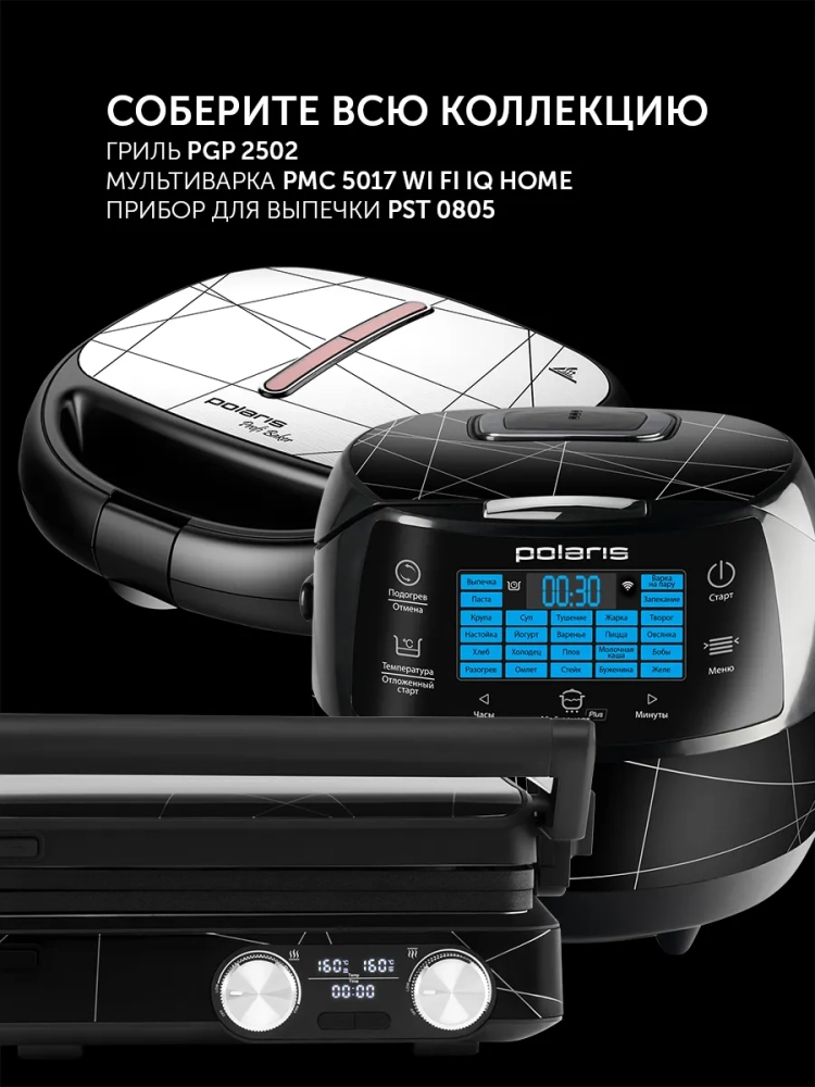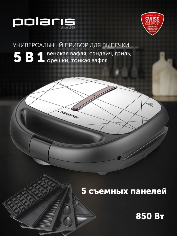 Многофункциональный прибор для выпечки. 5 пар съемных панелей: сэндвич, гриль, венская вафля, орешки, тонкая вафля. Автоматический контроль температуры. Антипригарное покрытие BIOTORE. Противоскользящие ножки. 2 индикатора работы. Мощность: 850 Вт.