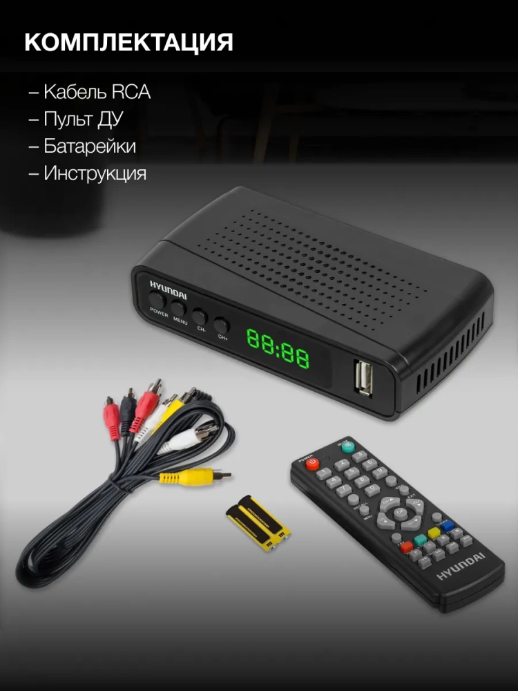 Ресивер Hyundai H-DVB520 – компактное устройство, благодаря которому возможно поддержание телевещания в актуальных стандартах. На корпусе девайса располагается несколько USB-портов. Остальные выходы смонтированы в задней части корпуса. Предусмотрена запись получаемого видео на USB-накопитель. Встроенный тюнер адаптирован для приема частот UHF, а также VHF. Кроме того, имеются функции цифрового радио, TimeShift, родительского контроля, возможность отображения субтитров, телетекста. Функциональность обеспечивается процессором GX6701. Модель идеальна для каждого любителя качественного видеоконтента.