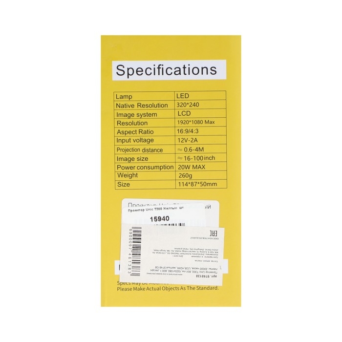 Проектор Unic T300, 800 лм,1920x1080, 800:1, ресурс лампы: 30000 часов, USB,HDMI, желтый