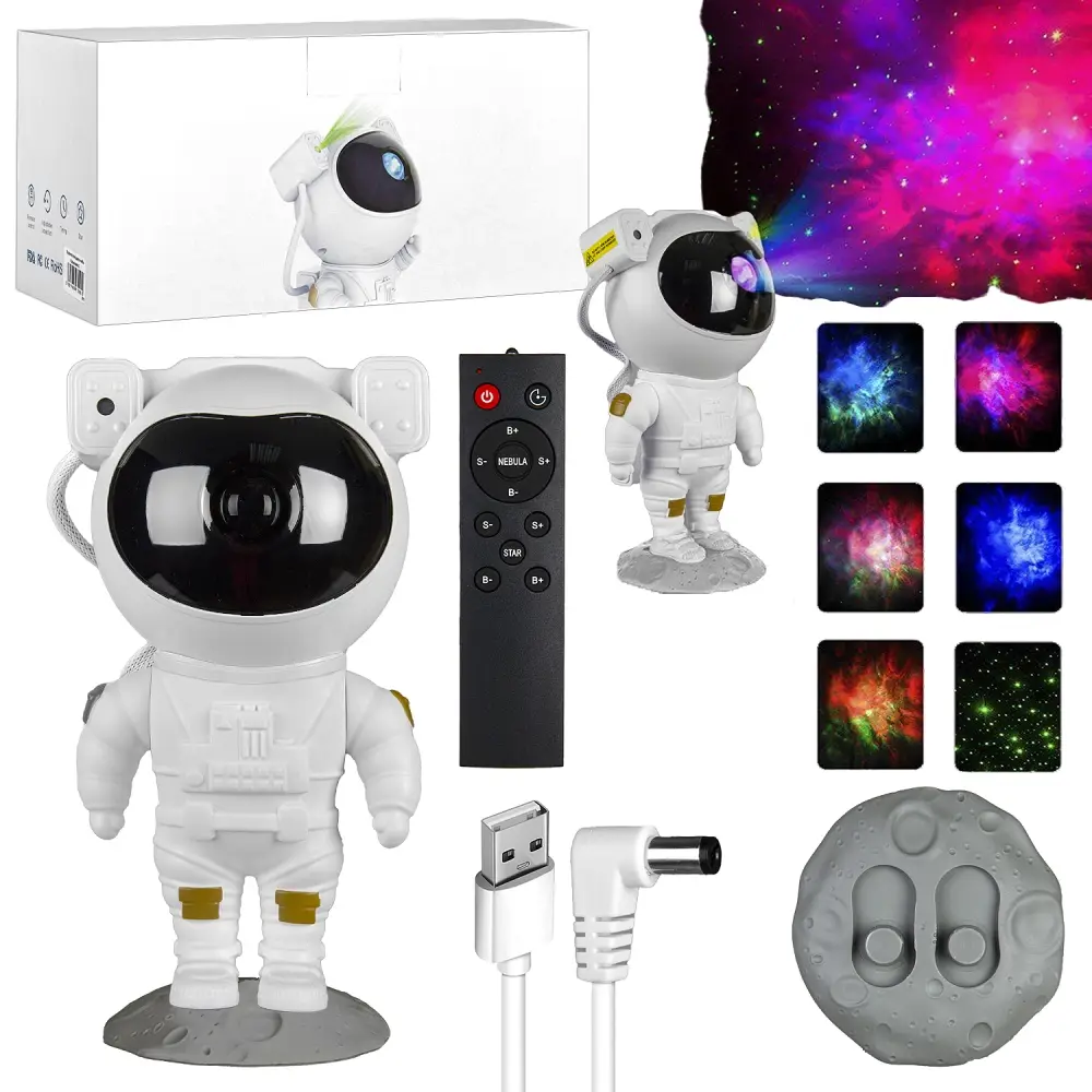 Управление - на самом космонавте (три кнопки: Выключатель/Переключатель туманности/Переключатель звёзд), либо с пульта ДУ ( питание от батареек ААА-2 шт, в комплекте не идут).