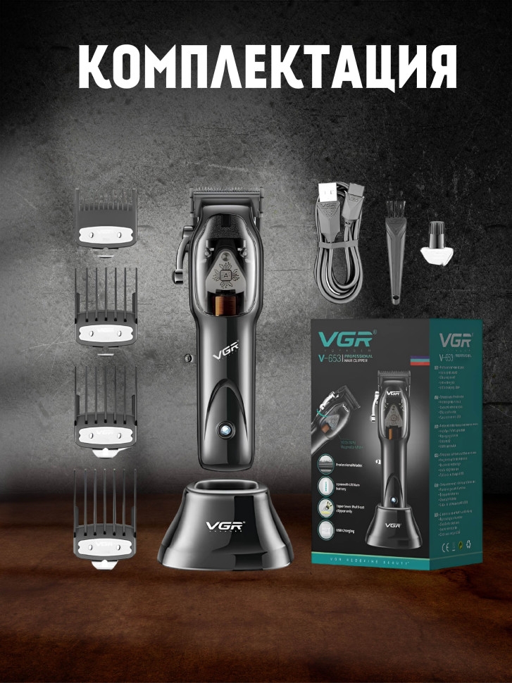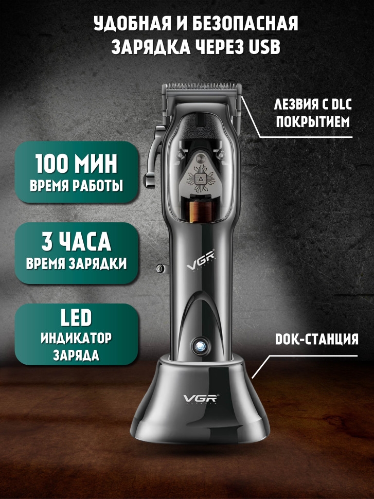 Беспроводная профессиональная машинка для стрижки волос VGR-653 обладает мощным магнитным мотором и удобным, эргономичным корпусом, материал которого не даёт машинке быстро нагреваться, что делает ее отличным инструментом как для бытового применения, так и для работы в салоне. Отлично подойдёт для удаления нежелательных волос на лице теле и голове. Магнитный тип мотора славится своей надежностью и мощью, 9000 оборотов в минуту способны справится даже с очень густым волосом. На лезвия из нержавеющей стали нанесено DLC, это крайне прочное алмазоподобное углеродное покрытие, устойчивое к царапинам и коррозии. Удобное расположения рычага регулировки длины лезвий позволит вам быстро и без труда настроить необходимую вам длину от 0.8 мм до 2 мм с шагом в 0.4 мм. При полностью заряженном аккумуляторе машинка способна работать до 100 минут. В комплекте находится стильная док-станция, на которой время полной зарядки составит 180 минут. Если вам нужно продолжать стричь, но батарея села, в комплекте есть USB провод длиною в 1.7 метра. Отличный подарок мужу парню папе отцу сыну брату. Является хорошим аналогом philips