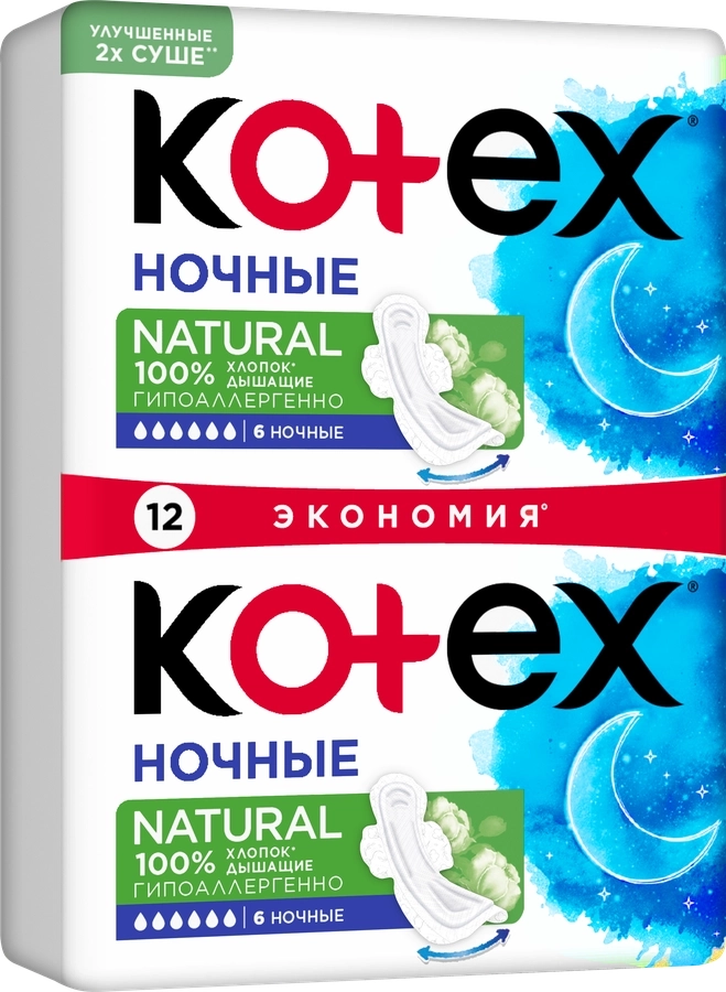 Женские гигиенические прокладки KOTEX Natural для обильных выделений во время сна. Лучшая защита от KOTEX для комфорта и уверенность до 100% ночью! Уникальный 3D центр – быстро впитывает. Прокладка лучше прилегает к телу – до 0% протеканий. Мягкие крылышки, надежно крепятся к белью и не натирают кожу. Эстетичная форма прокладки и нежный женственный дизайн добавят удовольствия при использовании. Верхнее покрытие прокладки из 100% хлопка (за исключением крылышек). Дерматологически протестировано