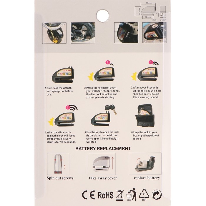 Противоугонный замок с звуковой сигнализацией устанавливается на тормозной диск, что блокирует движение колеса и представляет собой удобную механическую защиту вашей мото/вело-техники от хищения. Преимущество данного замка-блокиратора в небольшом весе и объеме, что позволяет легко и удобно возить его с собой.