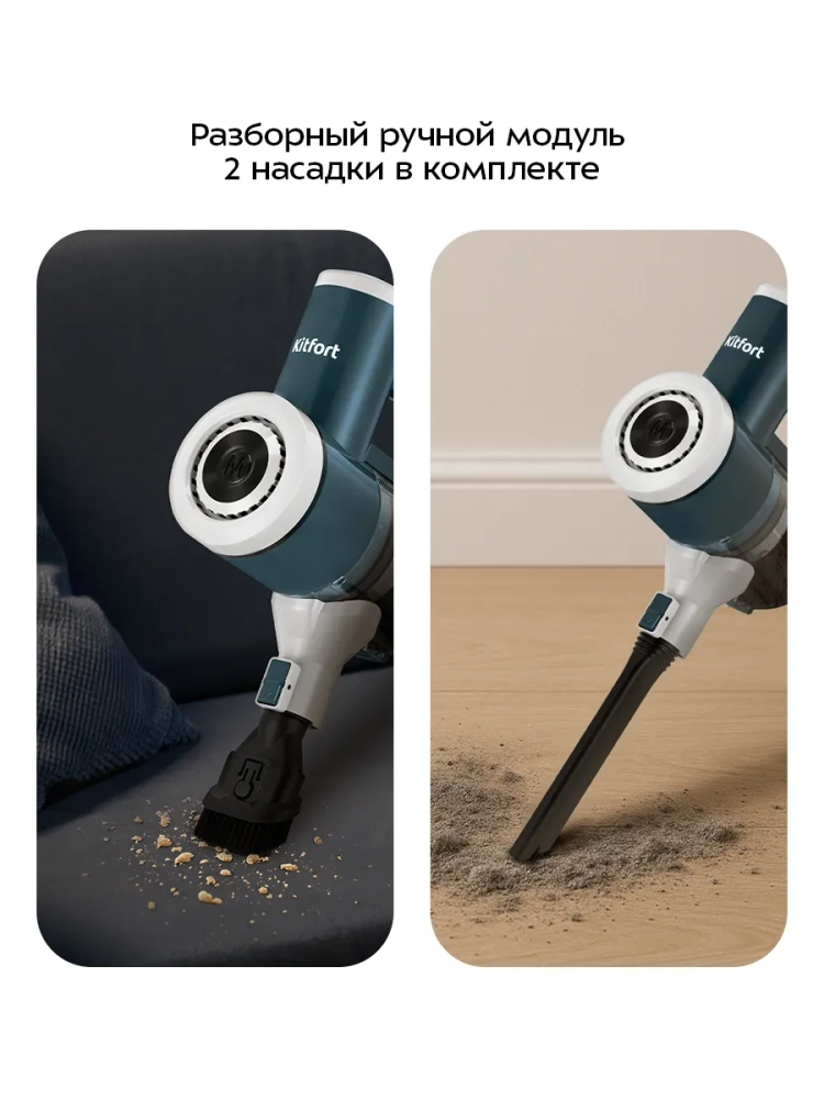 Вертикальный пылесос Kitfort КТ-5204 удобен при локальной и генеральной уборке. Он компактен, всегда под рукой и готов к работе. При отсоединении удлинительных трубок и установке насадок он легко трансформируется в ручной пылесос. Его конструкция позволяет легко убирать самые труднодоступные уголки квартиры. При этом не нужно передвигать громоздкий корпус прибора и управляться с непослушным шлангом. Пылесос оснащен маневренной напольной щеткой, которая вращается в двух плоскостях.