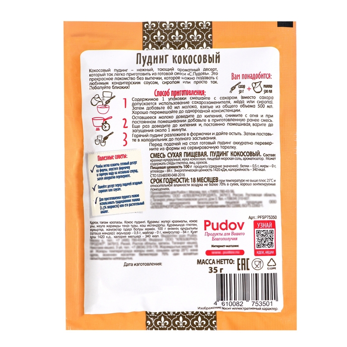 Готовая смесь для приготовления вкусного кокосового пудинга «С.Пудовъ» позволит вам легко и максимально быстро порадовать себя и близких великолепным нежным десертом. Чтобы приготовить пудинг, вам больше не нужно подбирать ингредиенты, следовать сложным расчётам в рецептах из непроверенных источников и переживать за готовый результат.