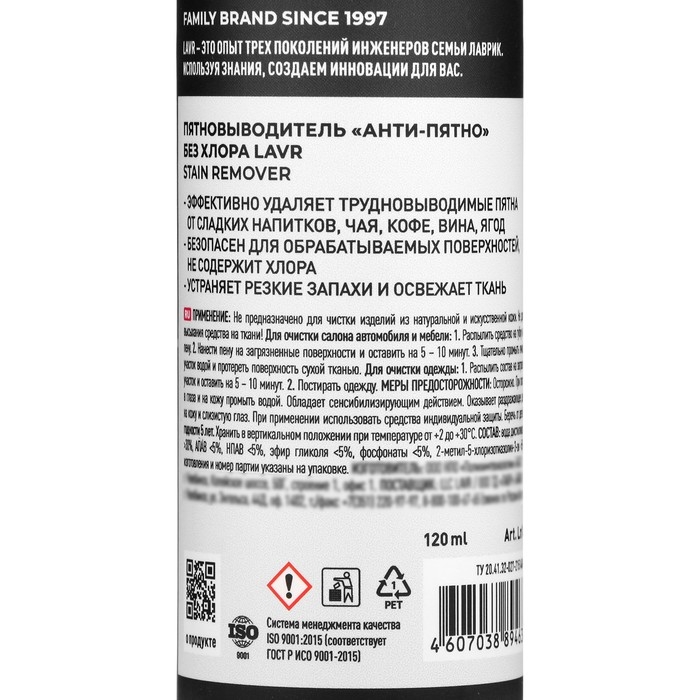 Пятновыводитель LAVR "Анти-Пятно" без хлора, 120 мл, спрей, Ln1465