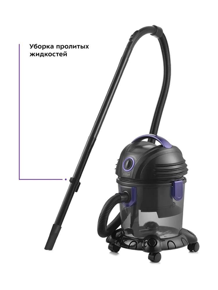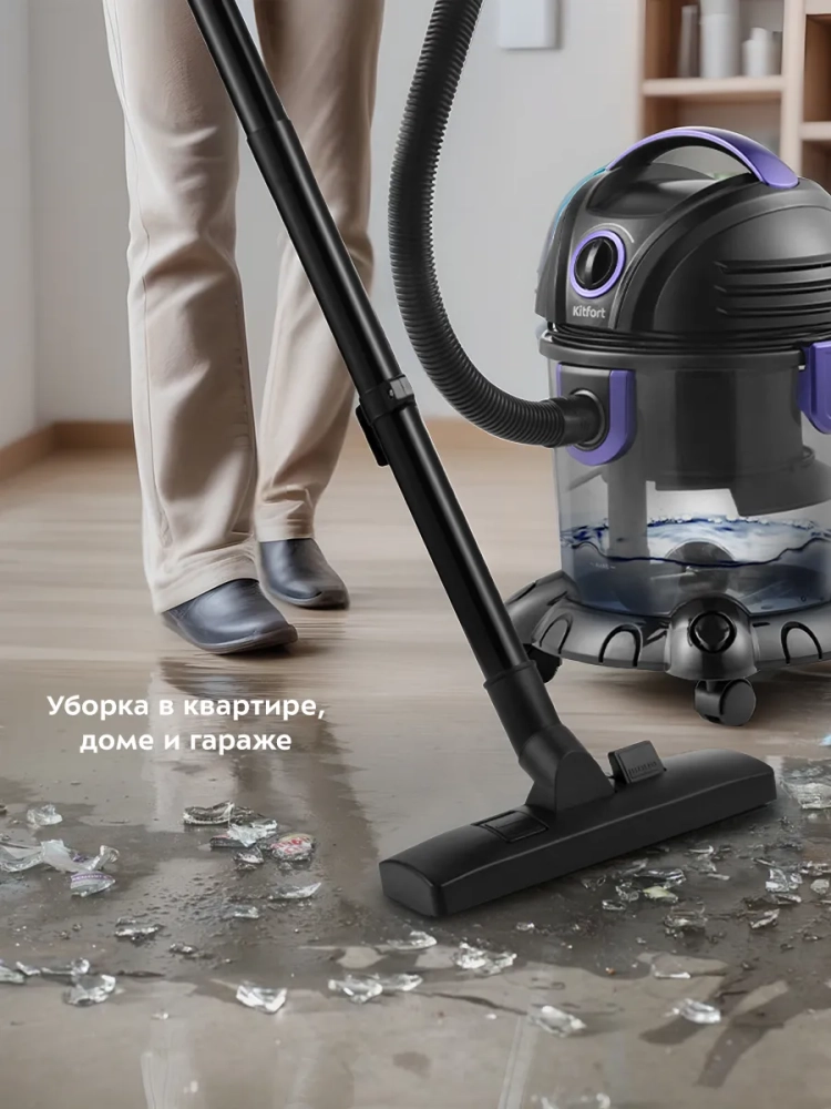 Пылесос Kitfort KT-5144 предназначен для влажной и сухой уборки. Пылесос собирает жидкости и грязь с поверхностей в пылесборник объемом 3,8 л. Благодаря функции влажной уборки можно собирать любые жидкости с пола и других поверхностей, также можно очищать душевые кабины и ванны. Для сухой уборки в резервуар для воды заливают воду. Вся пыль и грязь проходят фильтрацию через воду и фильтр тонкой очистки, благодаря чему выдуваемый воздух чистый. Это может быть особенно важно для аллергиков. Благодаря резервуару для воды, куда собирается вся грязь, пылесос очень удобно чистить после уборки — просто снимите моторный блок и вылейте грязную воду. Конструкция пылесоса без мешков для сбора пыли позволяет сохранять постоянную силу всасывания, легко очищать пылесос и не покупать мешки. Фильтр тонкой очистки можно мыть, поэтому срок службы такого фильтра очень долгий - его рекомендуют менять всего 1 раз в год. Функция выдува воздуха позволяет легко и быстро убрать листья с придомовой территории, накачать надувную кровать или матрас, почистить компьютер и комплектующие. Пылесос оснащен 4 колесиками - его легко возить за собой во время уборки. Длинный шнур обеспечивает удобство при уборке - можно не переключать пылесос из розетки в розетку, перемещаясь по дому.
