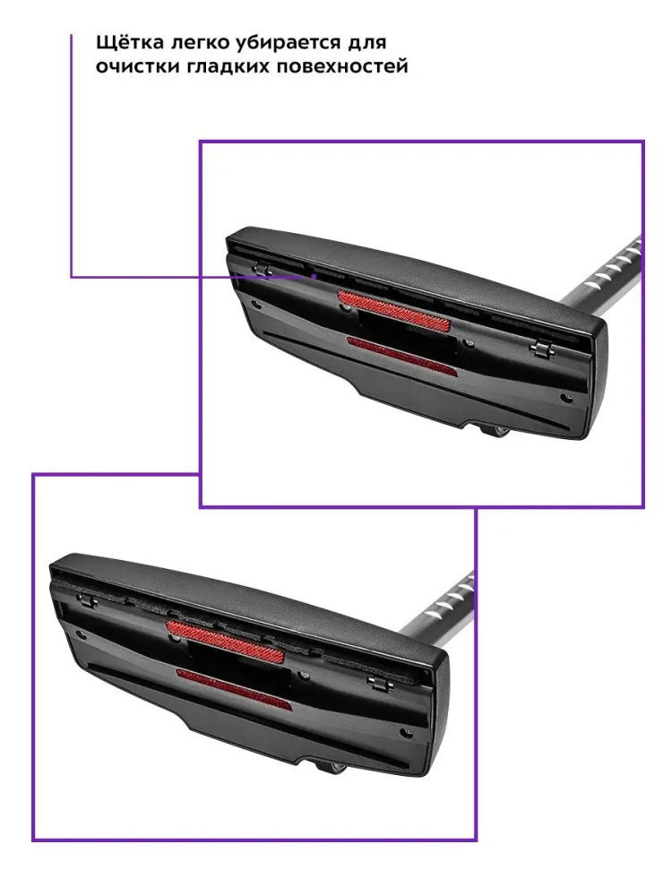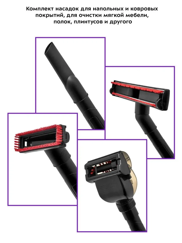 В комплекте к пылесосу идет набор из насадок для разных случаев уборки. Напольная щетка имеет педаль для быстрого переключения между чисткой ковра и гладких напольных покрытий. Это очень удобно, так как отпадает необходимость прерывать уборку, чтобы сменить насадку. Помимо напольной щетки в комплекте есть специальная щетка для паркета. Она предназначена для бережной и деликатной чистки паркета и ламината. Узкая насадка поможет вычистить щели, углы, плинтусы, радиаторы батарей и другие узкие места в квартире. Также в комплекте идет щетка «2 в 1» с ворсовой насадкой, которой можно убирать поверхности шкафов, подоконников и столов.