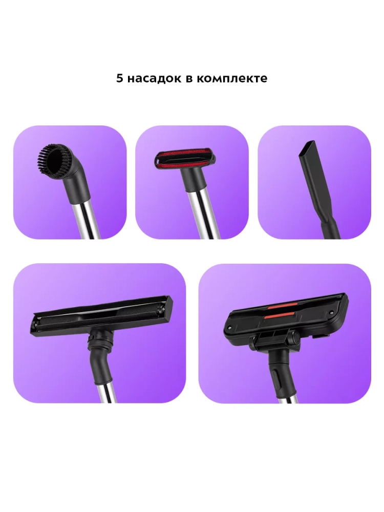 Узкая насадка позволит добраться до самых труднодоступных и узких мест. Круглая ворсовая щетка способствует лучшей очистке и не царапает поверхность. Щетка для сбора воды позволяет засасывать воду. Щетка для мебели справится с удалением волос, ниток и шерсти животных с мягкой мебели.