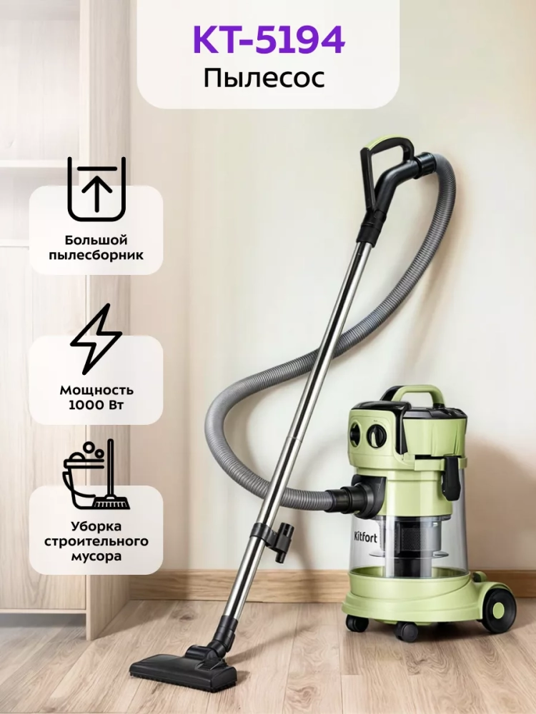 Пылесос Kitfort КТ-5194 предназначен для уборки бытовых помещений различной площади. Устройство способно собирать опилки, мелкий строительный мусор, а также пролитую на пол воду, и подойдет для уборки в гараже, мастерской, приусадебном участке или в квартире после ремонта.