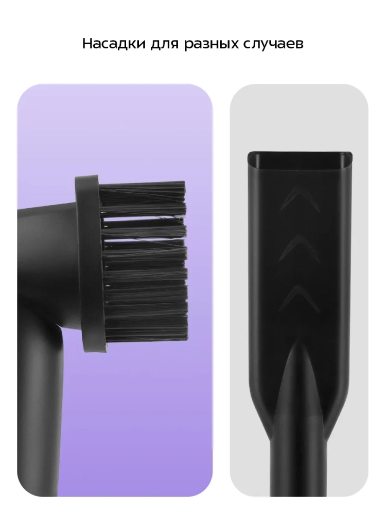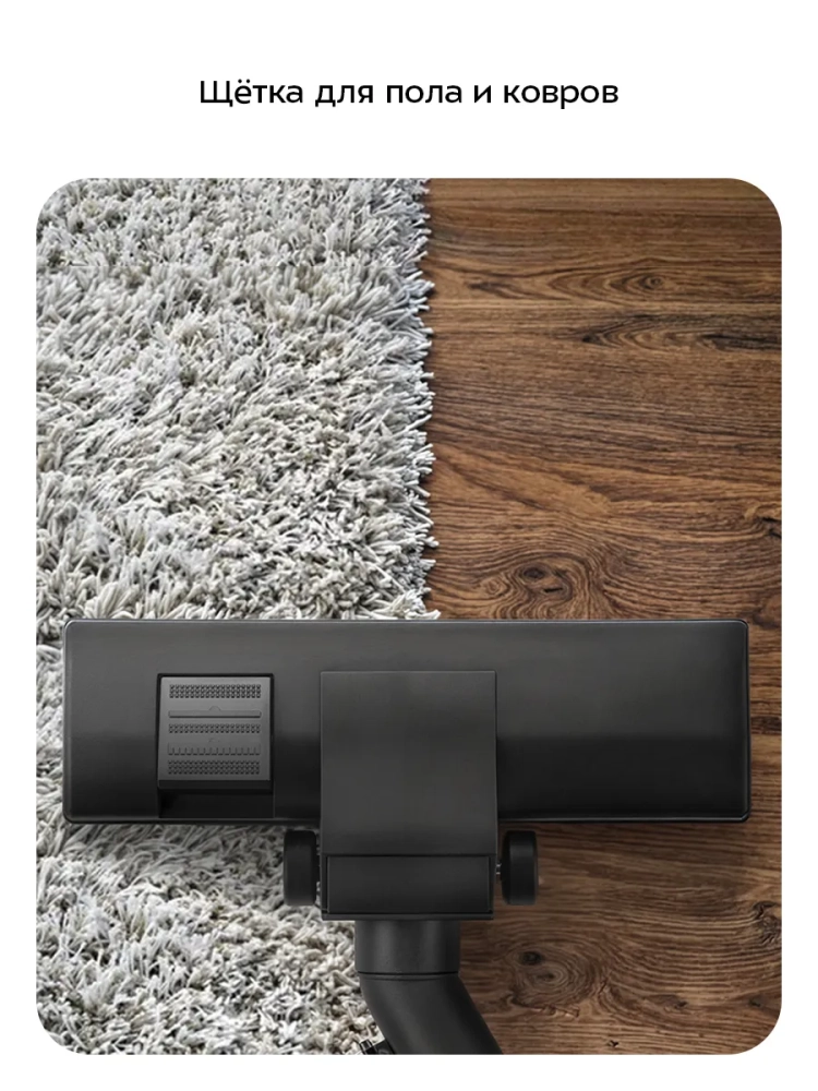 Щетка для пола имеет педаль для быстрого переключения между чисткой ковровых и гладких напольных покрытий. Это очень удобно, так как нет необходимости прерывать уборку, чтобы сменить насадку. Узкая насадка служит для уборки труднодоступных мест. Ворсовая щетка может использоваться для чистки ковров и ковровых покрытий, обивки мягкой мебели и сбора мелкого сыпучего мусора.