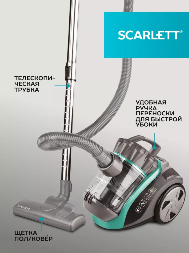 Большие колеса придают пылесосу маневренности и устойчивости, а металлическая трубка благодаря телескопической конструкции позволяет выполнять уборку пользователям любого роста.