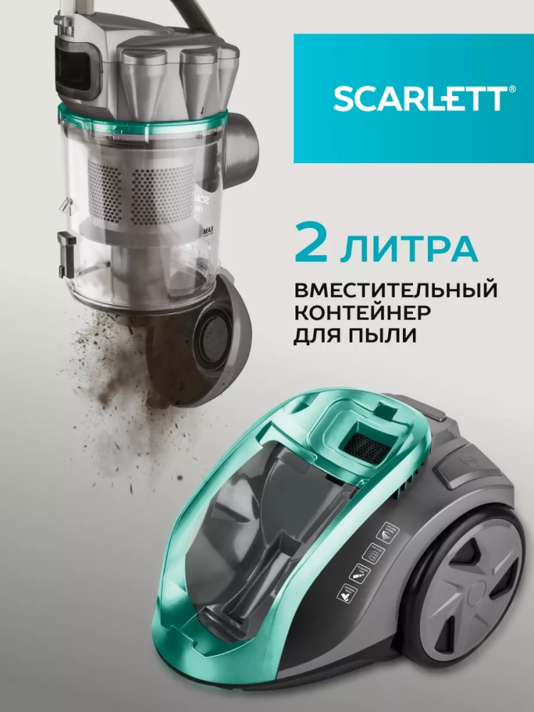 Контейнер для сбора пыли, вместимостью 2 литра, легко чистится и промывается водой, поэтому нет никакой необходимости в сменных расходных материалах. Легкое открытие контейнера нажатием одной кнопки облегчает процесс эксплуатации.
