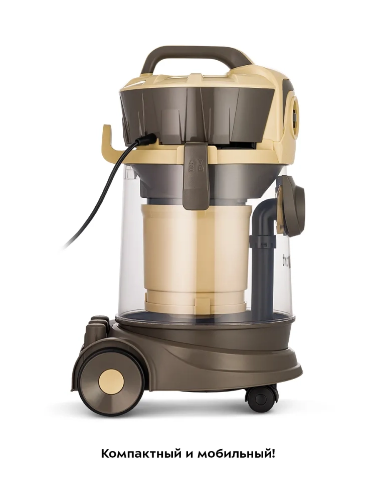 Пылесборник емкостью 15 литров подходит для генеральной уборки и уборки после ремонта. Он выполнен из прозрачного пластика, поэтому вы поймете, когда его следует очистить. Пылесборник с блоком фильтров легко очищаются и моются, что значительно облегчает уход за устройством.