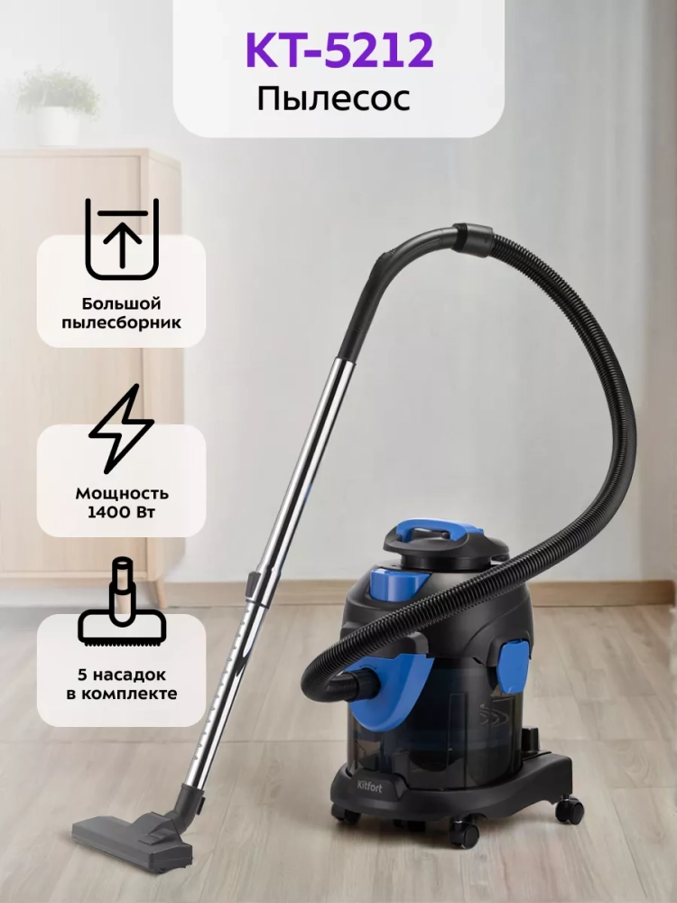 Пылесос Kitfort КТ-5212 имеет современную многоуровневую систему фильтрации, что позволяет провести качественную уборку. Благодаря комплекту насадок пылесос удобно использовать как при генеральной, так и при локальной уборке. Устройство поможет собрать мелкий строительный мусор и пролитую на пол воду, он также подойдет для уборки бытовых помещений различной площади.