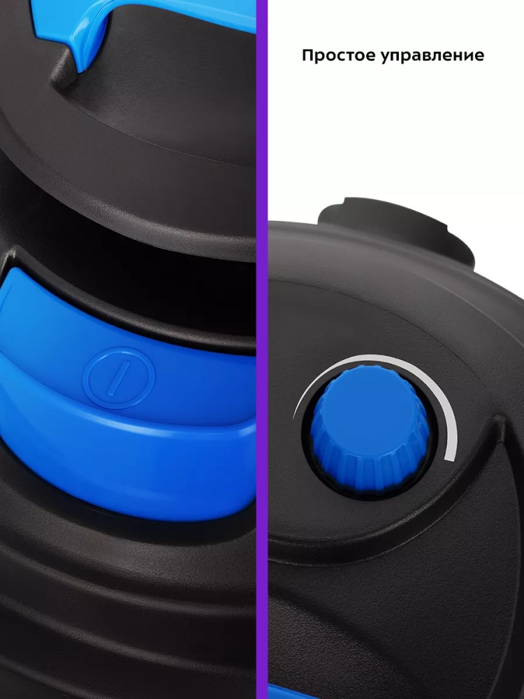У пылесоса простое управление с помощью кнопки и регулятора. Благодаря длинному шнуру питания удобно убирать помещения большой площади.