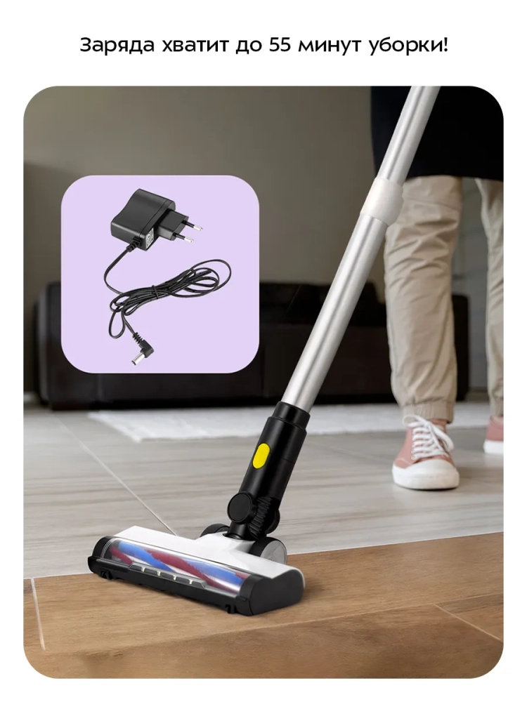 У пылесоса есть дисплей, на котором отображаются текущий уровень заряда аккумулятора, кнопка «Скорость» и индикаторы. У данной модели пылесоса 3 скорости работы. На первой скорости вертикальный пылесос работает без подзарядки до 55 минут, на второй — 35 минут, на третьей — 12 минут.