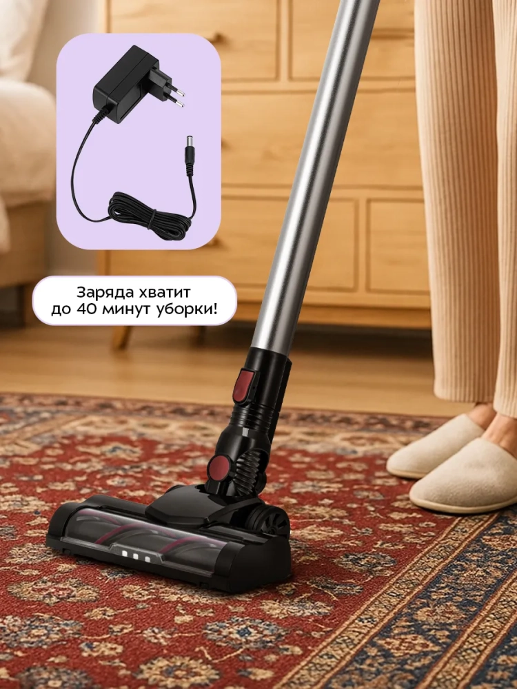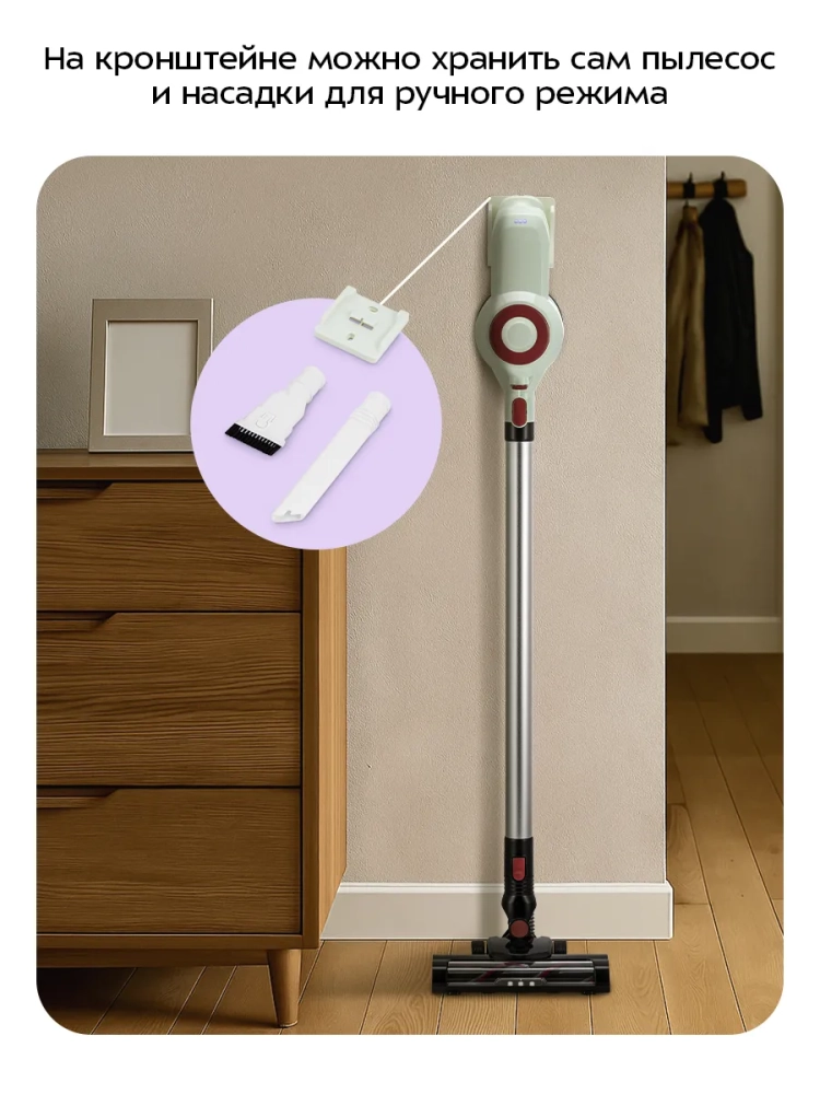 Одно из главных достоинств вертикального пылесоса — его компактность и маневренность. Пылесос поможет вам убраться в узком коридоре или комнате, заполненной мебелью и предметами. Для удобства хранения в комплекте поставляется кронштейн, который крепится к стене. Для владельцев небольших квартир, которые сталкиваются с проблемой хранения бытовых приборов, приобретение этой модели будет оптимальным вариантом.
