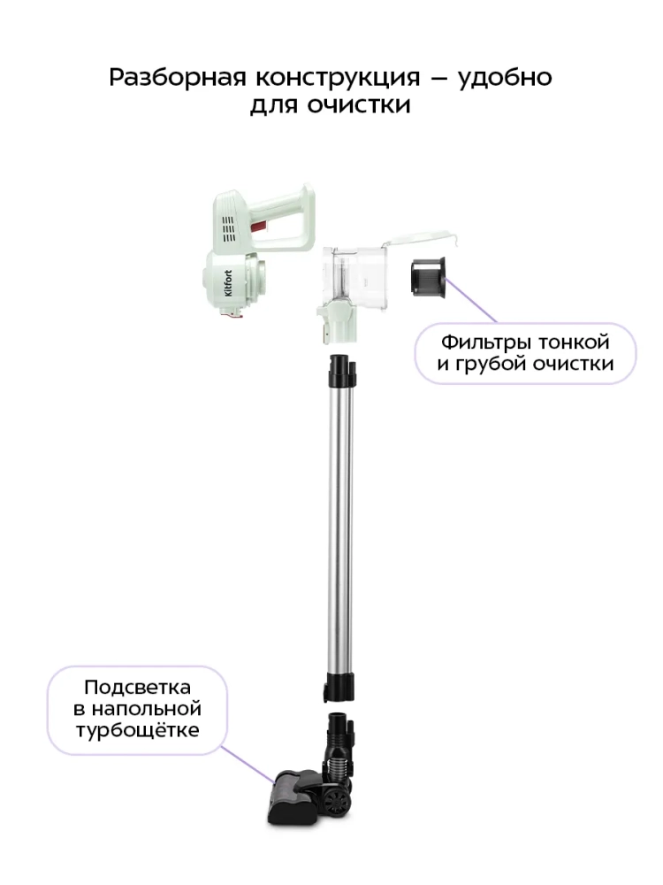 Беспроводной вертикальный пылесос Kitfort КТ-5346 очень удобен для проведения уборки. Он компактен, всегда под рукой и готов к работе. При отсоединении удлинительной трубки и установке насадок он превращается в ручной пылесос. Его конструкция позволяет легко проникать в самые труднодоступные уголки квартиры. При этом не нужно передвигать громоздкий корпус проводного пылесоса и управляться с непослушным шлангом. Благодаря работе от аккумулятора не нужно включать вилку в розетку, провода не мешают под ногами, поэтому пылесос имеет неограниченный радиус действия: от любого уголка квартиры до машины или беседки в саду. Пылесос оснащен маневренной напольной щеткой, которая вращается в двух плоскостях благодаря специальному шарниру.