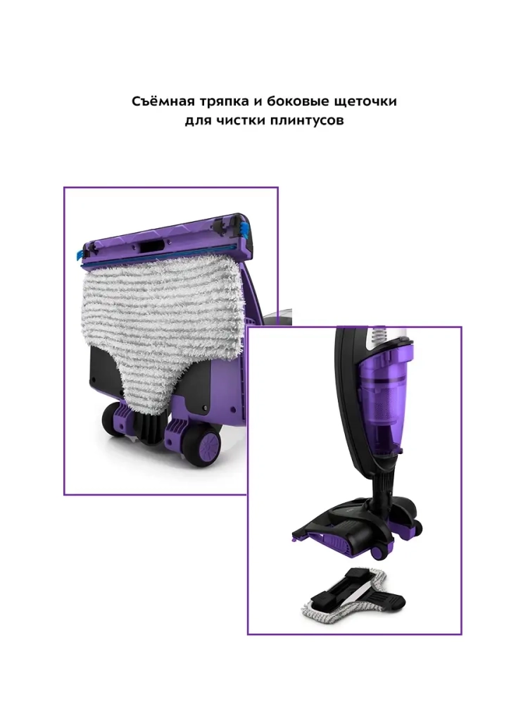 Пылесос оснащен резервуаром для воды, которая при нагреве дает пар, необходимый для влажной уборки и дезинфекции полов. Вы можете менять уровень подачи пара, так как для ламината уровень пара должен быть меньше, чем, например, для керамической плитки. После обработки паром пол почти сухой. Тряпка легко снимается и чистится.