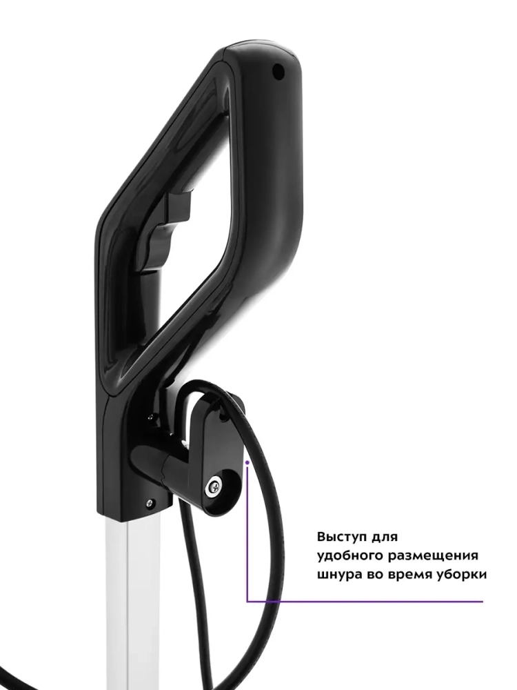 Вертикальный пылесос хорошо подходит для оперативной уборки, например, рассыпанных крошек или песка от обуви в коридоре. Длинный шнур позволяет убираться на большом расстоянии от розеток. На ручке пылесоса имеются специальные держатели для удобного хранения шнура.