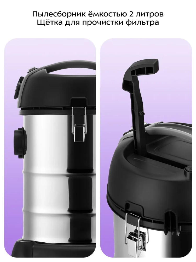 Пылесборник емкостью 25 литров подходит для уборки после ремонта, а очистить пылесборник очень легко. На корпусе пылесоса есть ручка щетки для прочистки фильтра тонкой очистки, т.е. прочистить фильтр можно этой щеткой, не снимая с пылесоса. У пылесоса простое управление одним переключателем. Благодаря длинному шнуру питания можно убирать помещения большой площади.