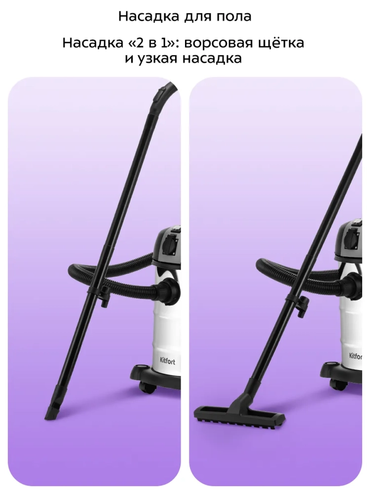 В комплекте к пылесосу идет насадка для пола и насадка «2 в 1». Насадка для пола предназначена для уборки напольных покрытий и хорошо всасывает воду.
