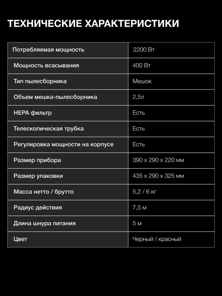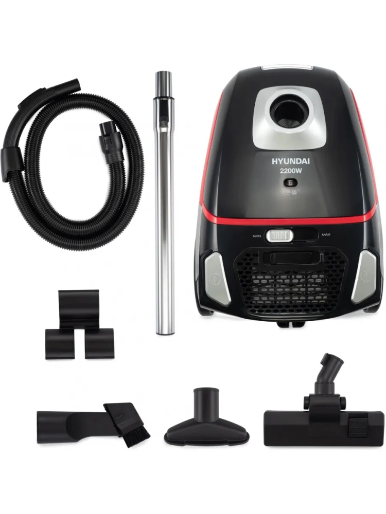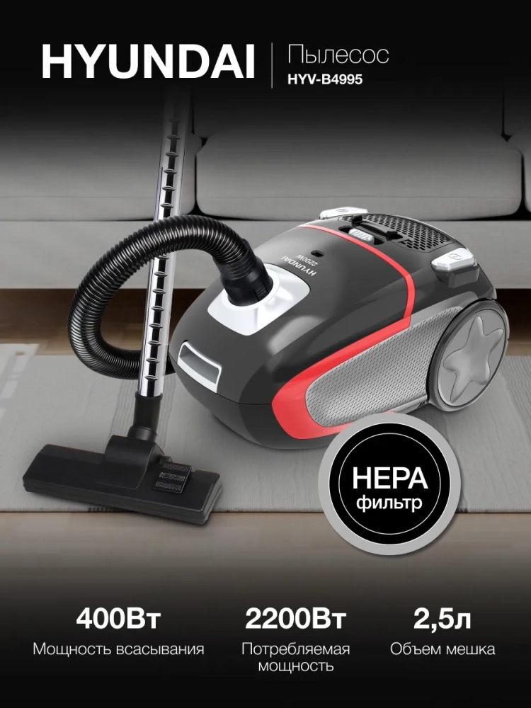 Пылесос Hyundai HYV-B4995 черный/красный, мощность 2220Вт, уборка: сухая, объем пылесборника 3.5л, мощность всасывания 400Вт, регулировка мощности на корпусе, длина шнура 5м