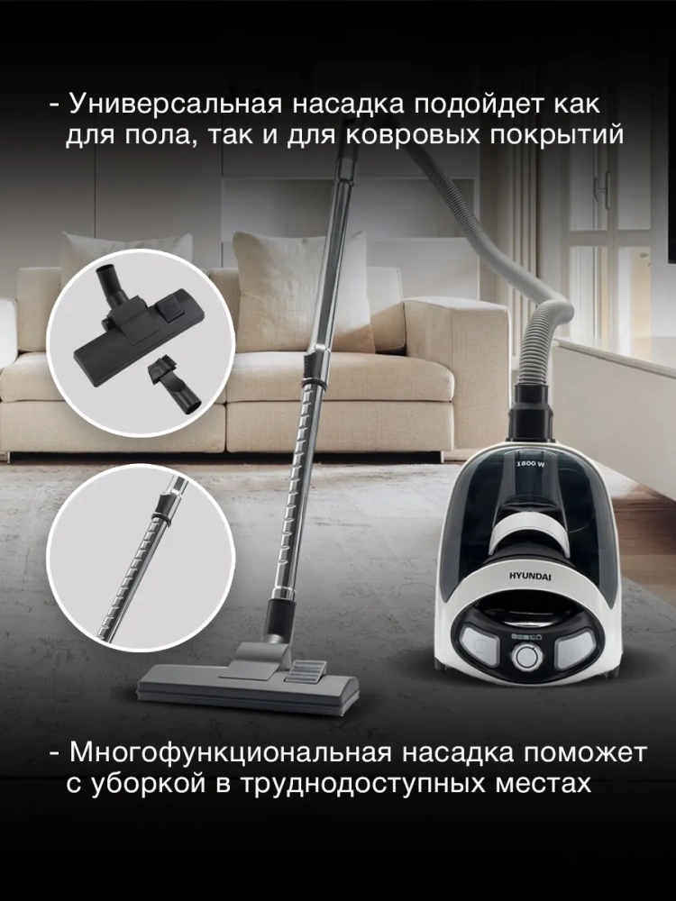 Труба Hyundai HYV-C1995 имеет классическую и зарекомендовавшую себя телескопическую конструкцию. В сочетании с тремя насадками, идущими в комплекте, она позволяет пробираться в самые отдаленные уголки помещений, где скапливается больше всего пыли.