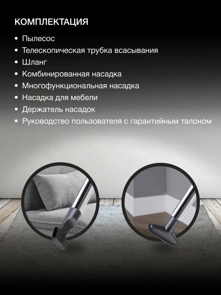 • Комплектация: включает насадки для пола, ковров, мебели и труднодоступных мест.