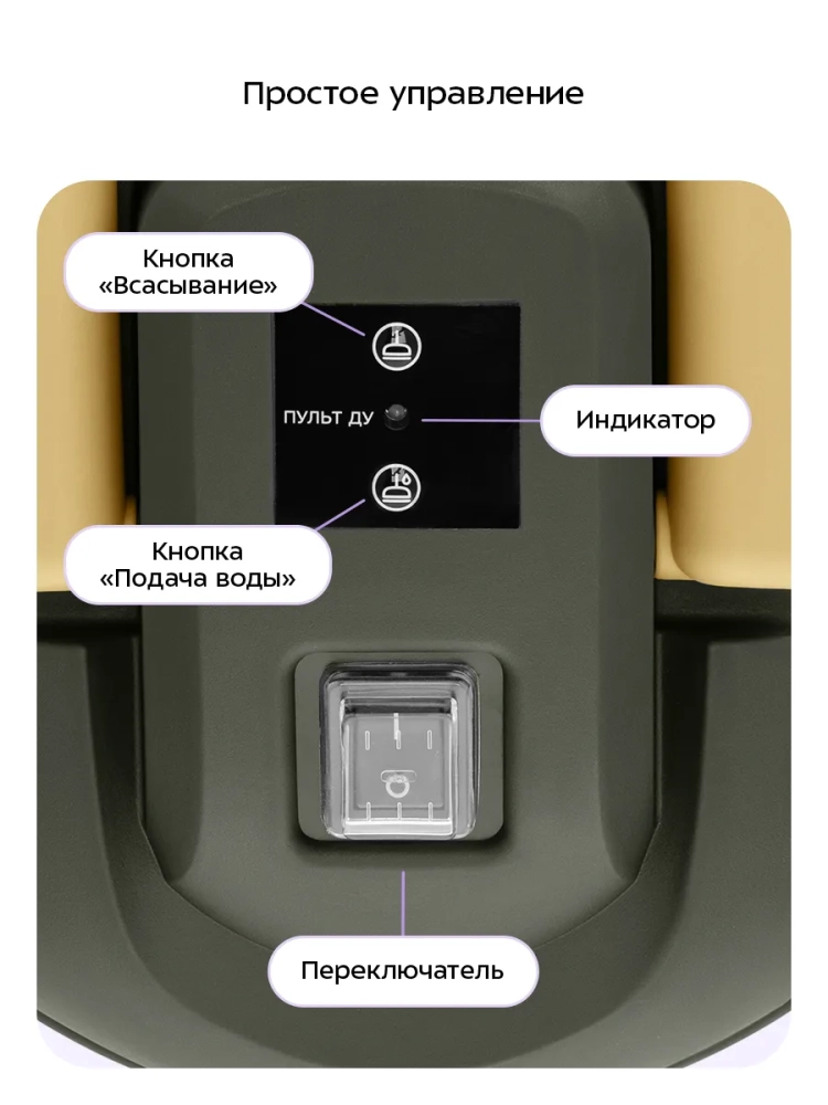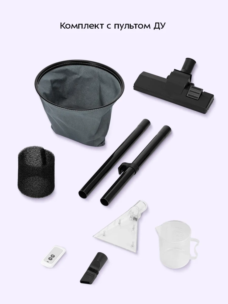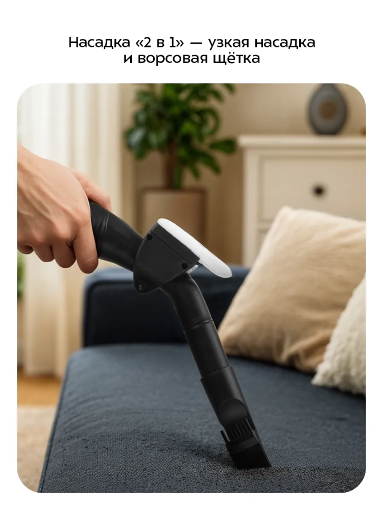 В комплекте идет насадка для пола, насадка «2 в 1» и моющая насадка. Насадка для пола имеет педаль для быстрого переключения между чисткой ковровых и гладких напольных покрытий. Это очень удобно, так как нет необходимости прерывать уборку, чтобы сменить насадку. Насадка «2 в 1» сочетает в себе узкую насадку для труднодоступных мест и ворсовую щетку для очистки поверхностей от шерсти. Моющая насадка используются для проведения влажной уборки и сбора воды.