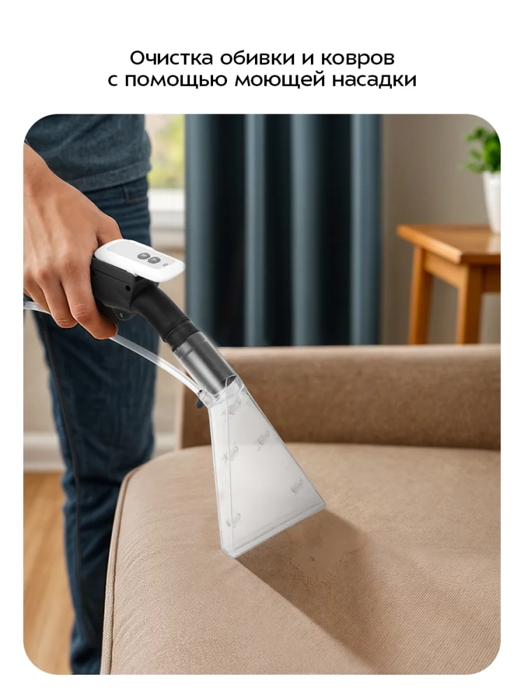 Также прибор можно использовать для проведения влажной уборки. Пылесос подает воду из резервуара для воды на очищаемую поверхность и всасывает воду с пылью и другими загрязнениями. Это позволяет очистить обивку дивана, кресел и другой мягкой мебели, а также ковры и ковровые покрытия. В резервуар для воды можно также добавить специальное моющее средство, которое не сильно пенится. Не добавляйте в резервуар другие чистящие средства, особенно средства, которые образуют большое количество пены.