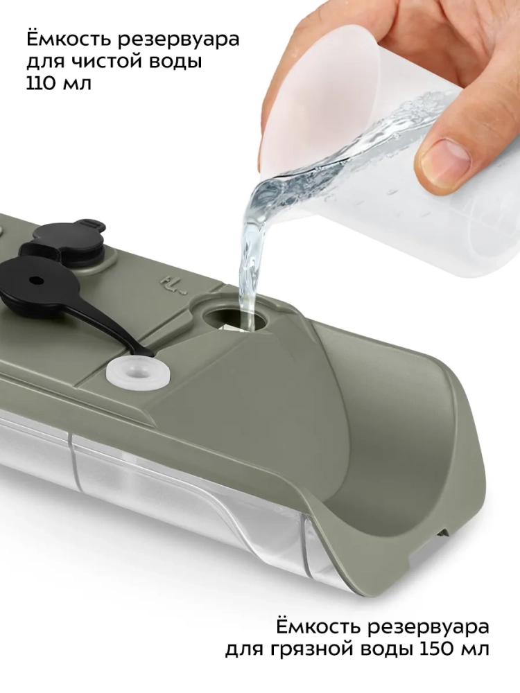 У прибора есть резервуар для воды с двумя отсеками: для чистой и грязной воды. Резервуары выполнены из прозрачного пластика, поэтому в процессе уборки хорошо видно, как много грязи собирает моющий пылесос. Пластиковая вставка, с помощью которой засасывается жидкость, тоже прозрачная, а также съемная — при необходимости ее легко снять и помыть.