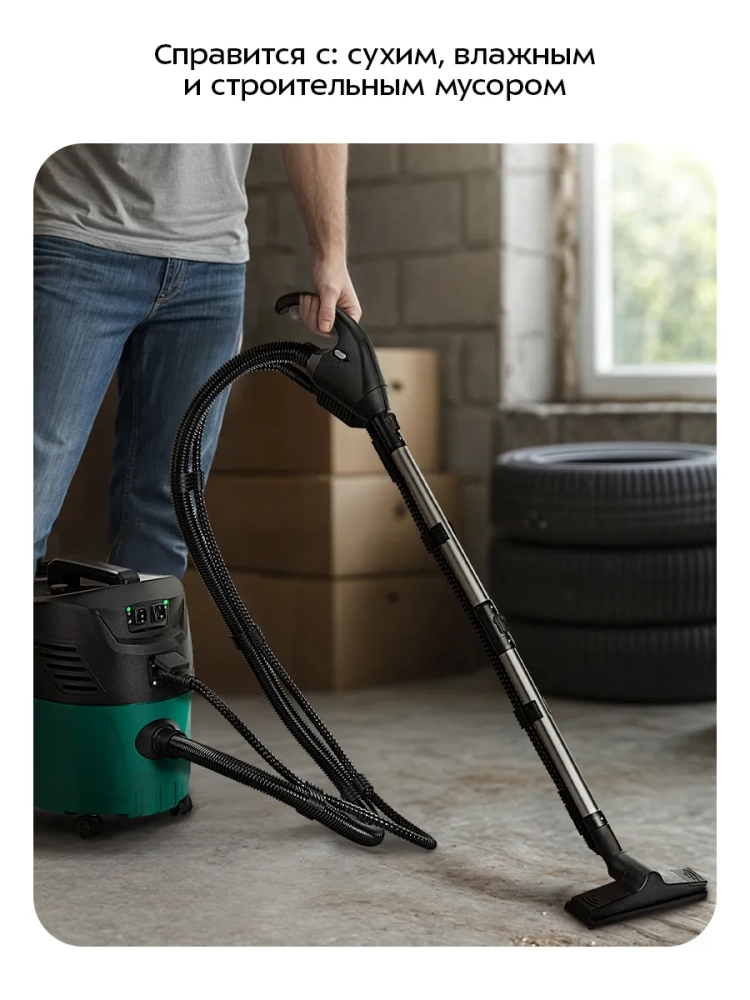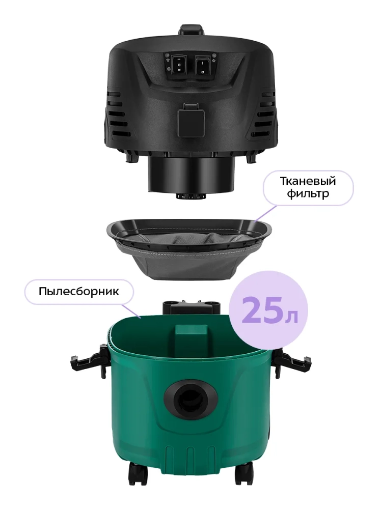 Пластиковый пылесборник емкостью 25 л подходит для уборки после ремонта и легко очищается. На дне моторного блока предусмотрен поплавковый предохранительный клапан, который поднимается по мере заполнения пылесборника. Когда пылесборник будет заполнен выше максимально допустимого уровня, предохранительный клапан перекроет отверстия и защитит мотор от попадания влаги. В таком случае пылесос перестанет всасывать жидкость. Прибор необходимо будет выключить, отключить от сети, а затем очистить пылесборник. Для сбора сухого мусора дополнительно устанавливается тканевый фильтр.