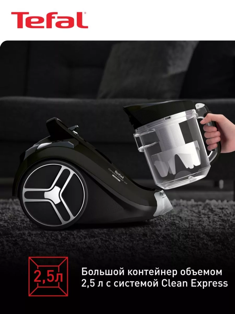 Пылесос Tefal Compact Power XXL TW4855EA идеально подходит как для небольшой квартиры, так и для большого дома, сочетая впечатляющую эффективность и большую вместимость в компактном корпусе. Многоразовый контейнер объемом 2,5 л создан для комфортного использования – его объемам хватает на несколько уборок, после чего его легко опустошить в мусорную корзину.
