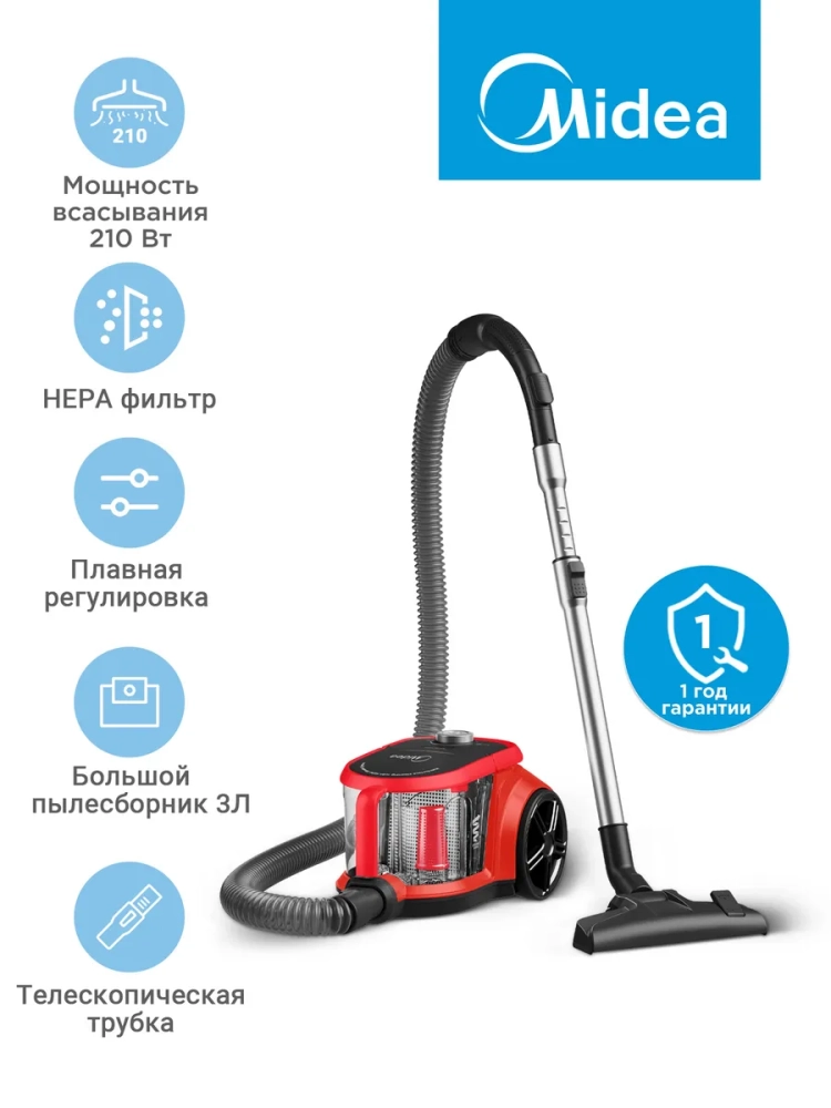 Пылесос Midea VCS41S160 предназначен для сухой уборки любого помещения. Максимальная мощность устройства 1600 Вт. Основное преимущество данной модели в контейнере для сбора пыли. В сравнении с мешком для сбора пыли, контейнер можно использовать неограниченное количество раз. По мере наполнение необходимо вытряхнуть пыль и промыть водой. Данный вид пылесборника экономичный (нет необходимости покупать каждый раз новые мешки), универсальный (помещается не только пыль, но и более крупные загрязнители). Объем пылесборника 3 литра. Мощность всасывания 210 Вт. Сетевой шнур длиной 5 метров, позволит легко и быстро передвигать пылесос.