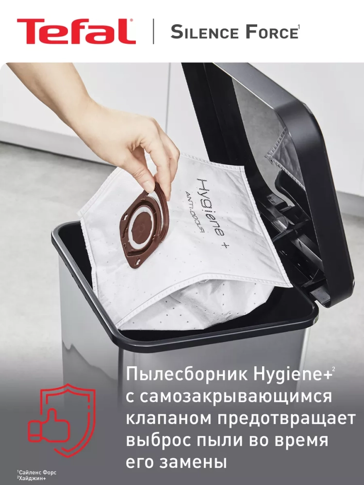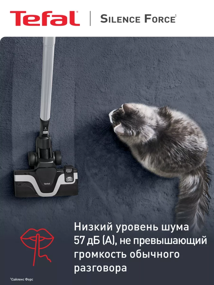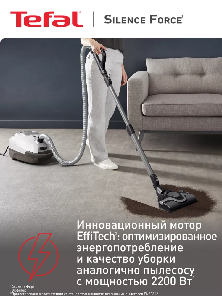 Пылесос с пылесборником Tefal Silence Force TW7487EA. Пылесос Silence Force – это мощный и бесшумный пылесос, который справится с любыми загрязнениями на любом типе покрытия. Инновационная двухпозиционная насадка Power Air плавно скользит как по паркету и плитке, так и по коврам и ковролину, показывая качественный и эффективный сбор пыли – лучший в классе пылесосов с пылесборником.