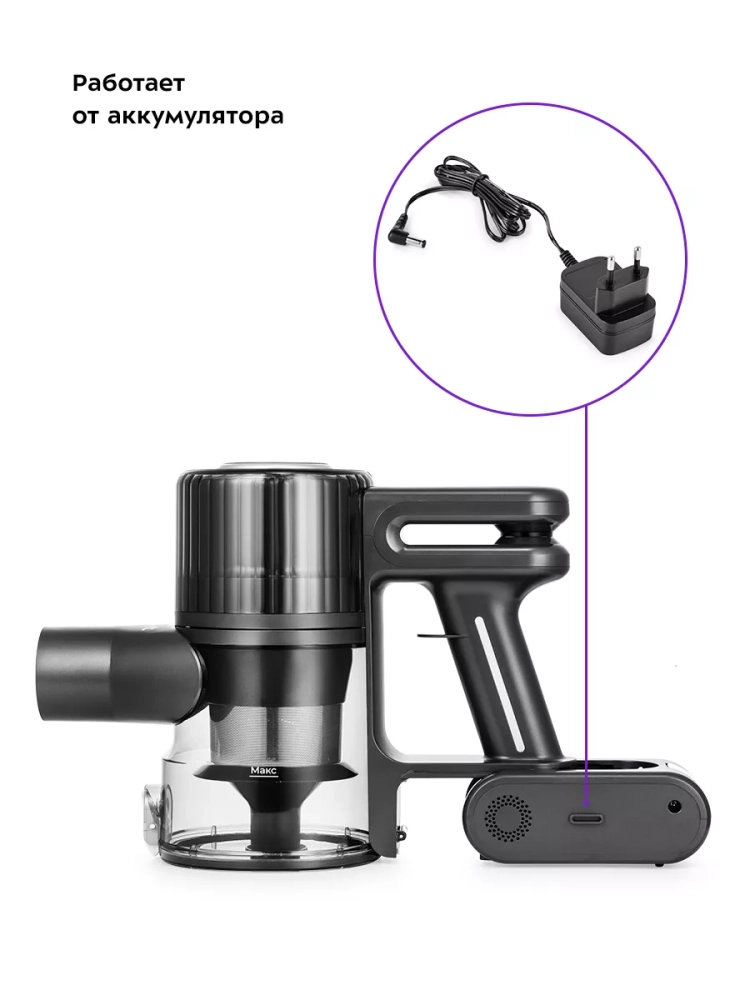 Благодаря работе от аккумулятора не нужно включать вилку в розетку, провода не мешают под ногами. Поэтому пылесос имеет неограниченный радиус действия: от любого уголка квартиры до машины или беседки в саду. Пылесос оснащен маневренной напольной щеткой, которая вращается в двух плоскостях.
