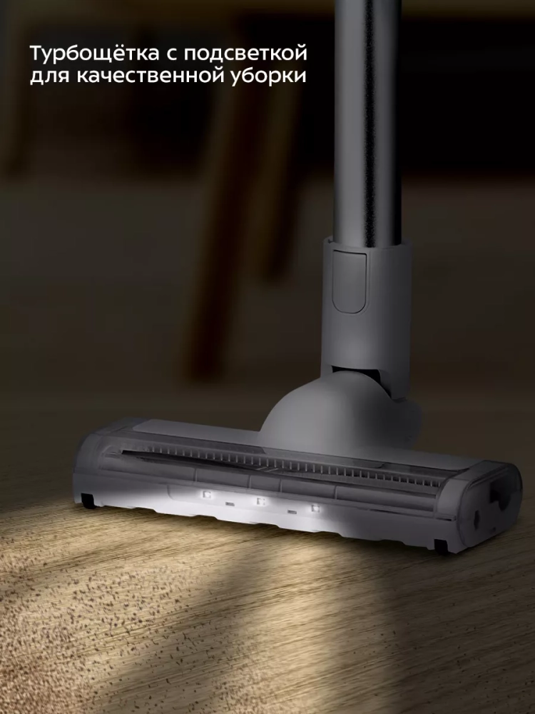 Пылесос комплектуется напольной турбощеткой с двумя валиками: мягким валиком для гладких поверхностей и валиком с щеткой для ковровых покрытий. Турбощетка помогает качественно справиться с очисткой гладких и ковровых напольных покрытий с не очень длинным ворсом. Светодиодная подсветка турбощетки сделает уборку комфортной даже в затемненных местах. Также к пылесосу прилагаются насадка «2 в 1», плоская насадка и кронштейн для настенного хранения устройства.