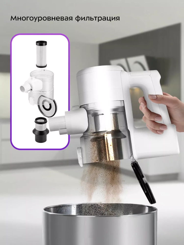 Конструкция «2 в 1» предусматривает наличие ручного пылесоса, который удобно использовать отдельно. Ручным пылесосом можно пропылесосить углы и плинтусы, обивку мебели, пыль со шкафов, шкафчики на кухне или в гостиной, книжные полки, коврики в автомобиле или багажник.