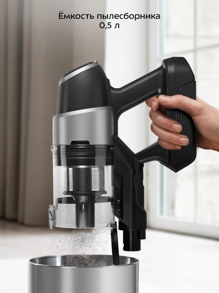 Конструкция «2 в 1» предусматривает наличие ручного пылесоса, который удобно использовать отдельно. Ручным пылесосом можно пропылесосить углы и плинтусы, обивку мебели, пыль со шкафов, шкафчики на кухне или в гостиной, книжные полки, коврики в автомобиле или багажник.