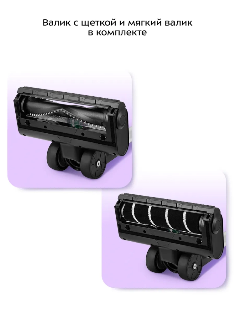 Пылесос комплектуется напольной турбощеткой с двумя валиками: мягким валиком для гладких поверхностей и валиком с щеткой для ковровых покрытий. Турбощетка помогает качественно справиться с очисткой гладких и ковровых напольных покрытий с не очень длинным ворсом. Светодиодная подсветка турбощетки сделает уборку комфортной даже в затемненных местах. Также к пылесосу прилагаются насадка «2 в 1», плоская насадка и кронштейн для настенного хранения устройства.