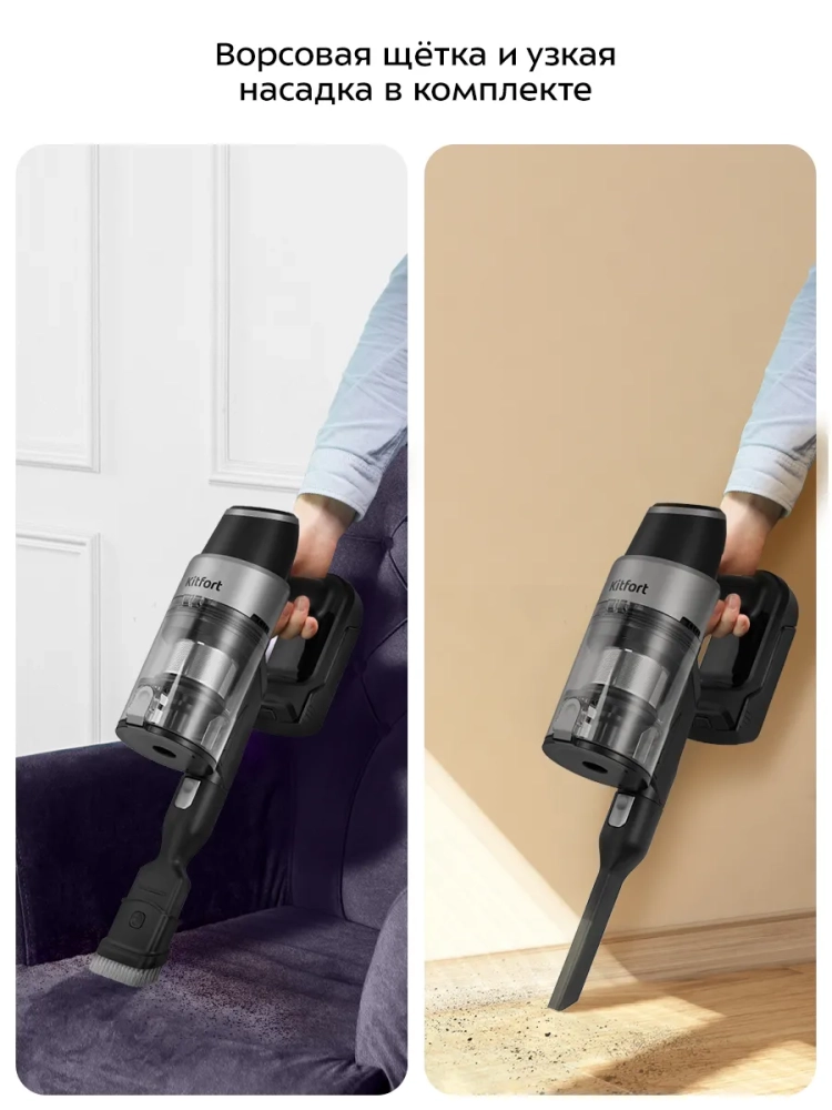 Беспроводной вертикальный пылесос Kitfort КТ-5278 очень удобен при локальной уборке. При отсоединении удлинительной трубки и установке насадки он превращается в ручной пылесос. Его конструкция позволяет легко проникать в самые труднодоступные уголки квартиры. При этом не нужно передвигать громоздкий корпус проводного пылесоса и управляться с непослушным шлангом. Благодаря работе от аккумулятора не нужно включать вилку в розетку, провода не мешают под ногами. Пылесос оснащен маневренной напольной турбощеткой, которая вращается в двух плоскостях.