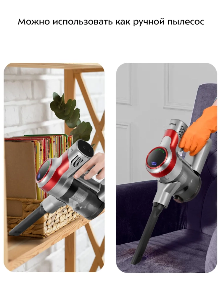 Конструкция пылесоса предусматривает наличие ручного модуля, который удобно использовать с насадкой «2 в 1». Ручным пылесосом можно пропылесосить углы и плинтусы, обивку мебели, пыль со шкафов, шкафчики на кухне или в гостиной, книжные полки, коврики в автомобиле или багажник.