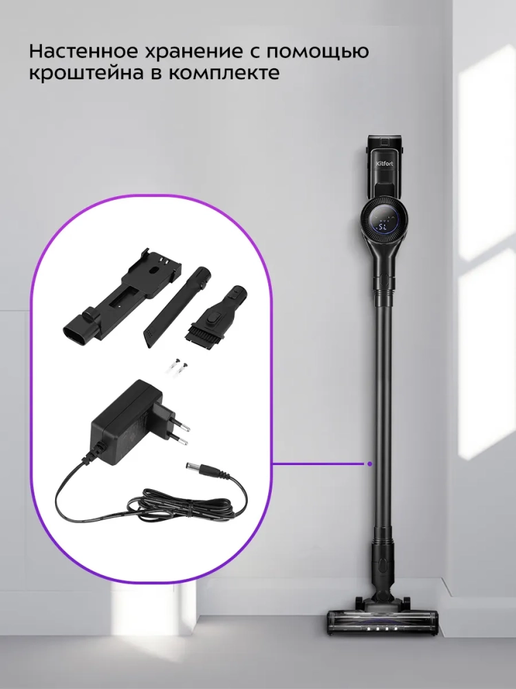 Пылесос комплектуется напольной насадкой с турбощеткой, которая помогает качественно справиться с очисткой гладких поверхностей и ковровых покрытий с не очень длинным ворсом. Светодиодная подсветка напольной щетки сделает уборку комфортной даже в затемненных местах. Также к пылесосу прилагаются насадка «2 в 1» и плоская насадка, кронштейн для настенного хранения устройства.
