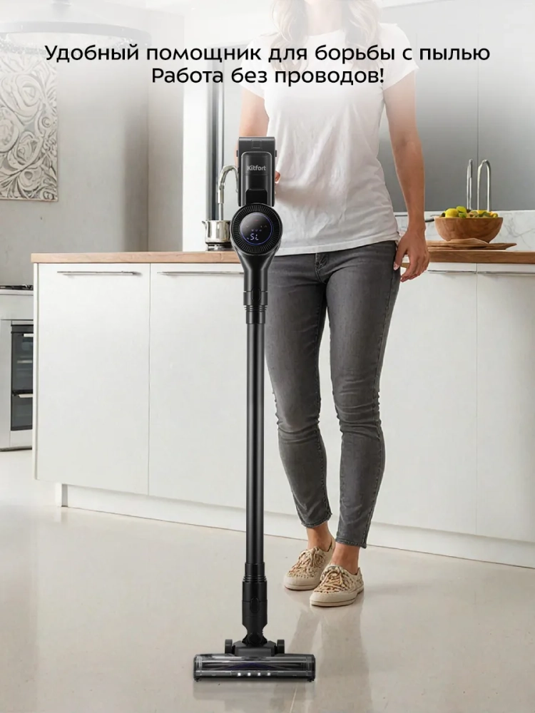 Беспроводной вертикальный пылесос Kitfort КТ-5283 очень удобен при локальной уборке. Он компактен, всегда под рукой и готов к работе. При отсоединении удлинительной трубки и установке насадки он превращается в ручной пылесос. При этом не нужно передвигать громоздкий корпус проводного пылесоса и управляться с непослушным шлангом. Благодаря работе от аккумулятора не нужно включать вилку в розетку, провода не мешают под ногами. Пылесос оснащен маневренной напольной турбощеткой, которая вращается в двух плоскостях.