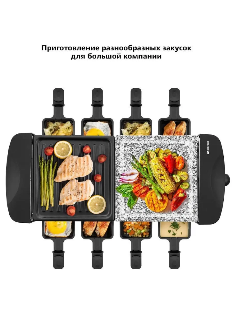 Раклетница Kitfort КТ-1647 - это устройство для приготовления разнообразных закусок, а также она может объединить вокруг себя теплую компанию друзей. Современная раклетница КТ-1647 имеет два яруса. На нижнем ярусе готовят сыр в порционных сковородках, верхний ярус представляет собой комбинированную жаровню, на которой можно приготовить мясо, креветки, колбаски-гриль, овощи и многое другое. На каменной плите лучше жарить мясо, а ребристая поверхность панели с антипригарным покрытием прекрасно подойдет для овощей. Раклетница оснащена термостатом и индикатором нагрева. Приглашайте гостей и родственников, и устраивайте раклет-вечеринку. Пока на сковородках плавится сыр, гости приготовят начинку по своему вкусу: обжарят на панели для гриля кусочки картофеля или перца, приготовят стейк или колбаски. Вам нужно только подготовить ингредиенты и поставить их к раклетнице на стол.