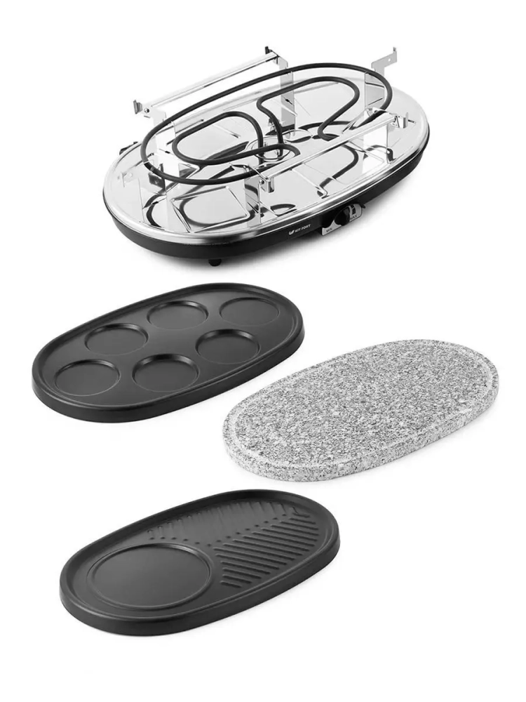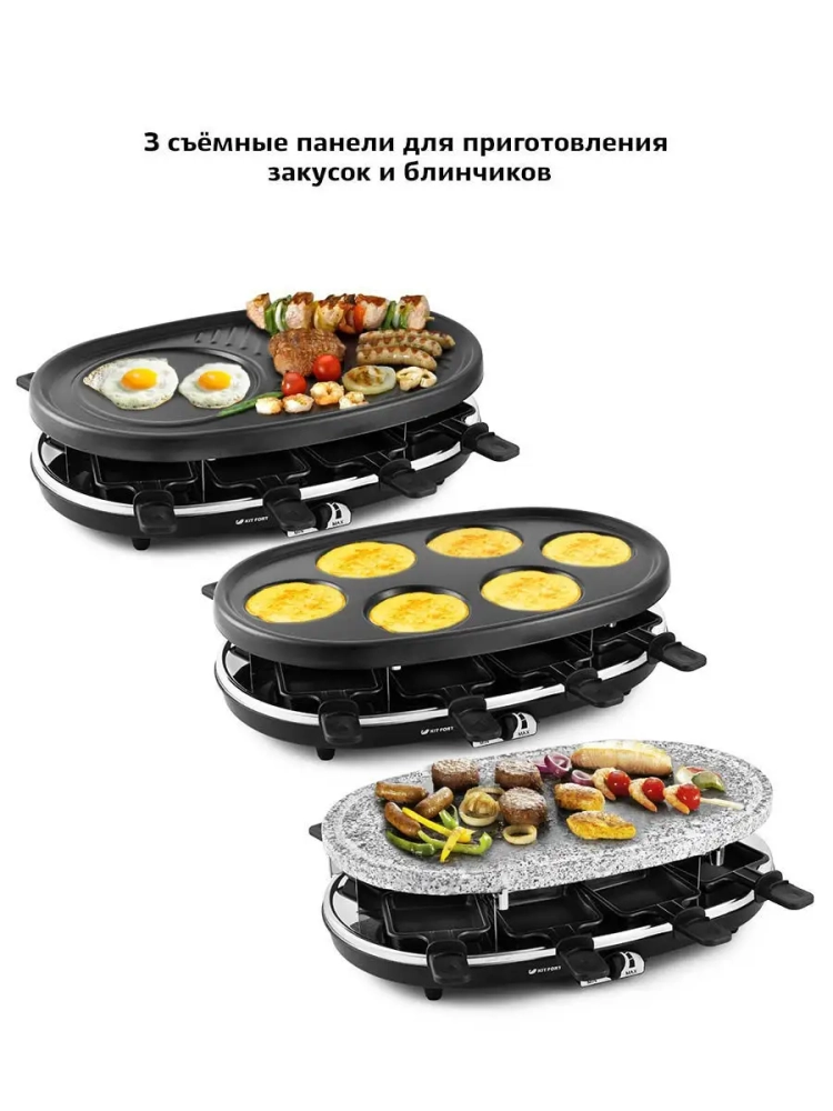 Современная раклетница Китфорт КТ-1651 имеет два яруса. На нижнем ярусе готовят сыр в порционных сковородках, на верхний ярус устанавливается одна из трех панелей:
