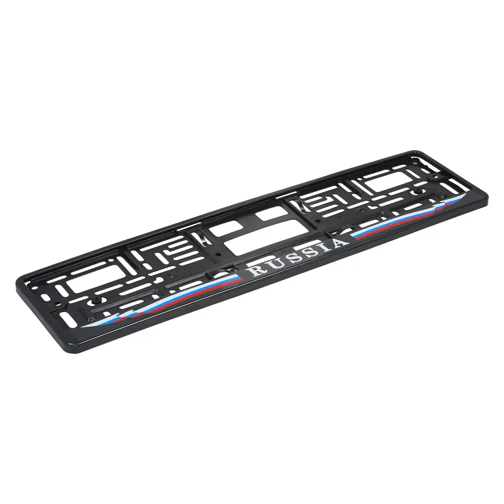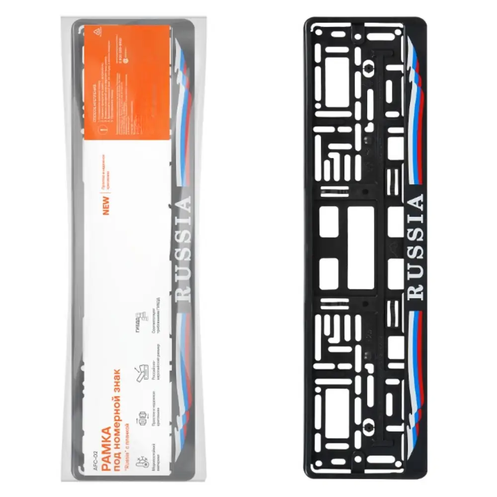 Рамка изготовлена из материалов, не подверженных морозу и перепадам температур. Установка рамки не займет много времени, т.к. изделие имеет простой механизм крепления, представляющий собой планку с запорным механизмом. Данная модель рамки украшена надписью «Russia» и триколором российского государства на нижней стороне изделия.
