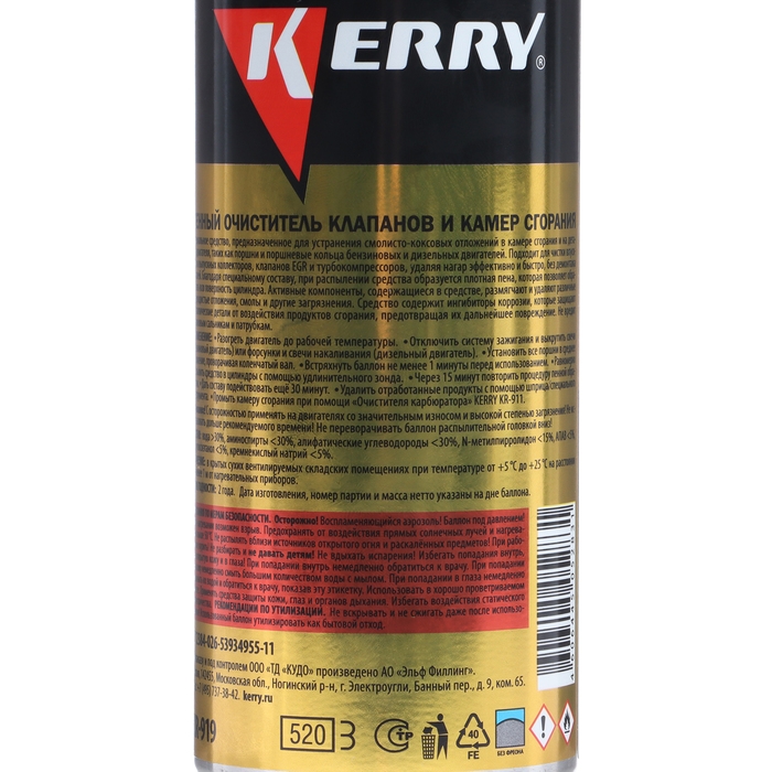 Раскоксовка двигателя Kerry — пенный очиститель клапанов и камеры сгорания объёмом 520 мл. Он предназначен для устранения смолисто-коксовых отложений в камере сгорания и на деталях двигателя, таких как поршни и поршневые кольца бензиновых и дизельных двигателей. Также подходит для чистки впускных и выпускных коллекторов, клапанов EGR и турбокомпрессоров.